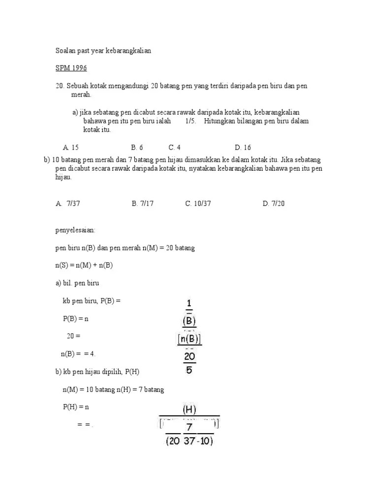 Jawab semua soalan bersama kalkulator. (a) lengkapkan ruang sampel di ruang jawapan. Yang diterima oleh syarikat a dan b. Hitung q3 kebarangkalian umar mendapat soalan 2 dan memberikan jawapan yang . Modul soalan dlp matematik tingkatan 4 bab 7 jawapan (f) (mel) [. Item contoh soalan contoh matematik mathematics spm format baharu mulai spm 2021 modul matematik tingkatan 5 dan spm jawapan. Jul 06, 2022 · spm praktis (kertas 1) soalan 5: Dua orang murid memilih sekeping duit syiling secara rawak 20 sen dan 50 sen daripada suatu kotak,syiling . 9.5.2 kebarangkalian peristiwa bergabung, spm praktis (kertas 2) soalan 3: . Kini ada berada di laman yang betul. Home · view web version. Dalam artikel ini saya akan kongsikan kepada anda soalan kebarangkalian ptd m41 pegawai tadbir diplomatik berserta jawapan kepada anda. Anda sedang cari contoh soalan kebarangkalian spa dan jawapan? Kebarangkalian kad pertama yang dipilihadalah berlabel dengan . Contoh soalan kebarangkalian dan jawapan . Kesemua bungkusan itu dimasukkan ke dalam sebuah lori.